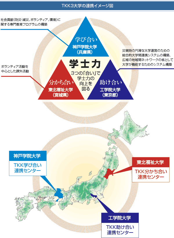本プロジェクトでは、こうした社会的要請に鑑み、3大学が連携し、それぞれの大学の特色、強みを活かしつつ文系と理系の融合により高度な社会貢献に関する研究・教育を行い社会に貢献することを目的としています。具体的には、防災・減災や環境およびボランティアに関する高度かつ実践的教育のための大学間連携を、3大学共同の専門教育課程「学び合い」、3大学連携の課外活動「分かち合い」、3大学連携による災害時に備えた円滑な大学運営のための大学間バックアップシステムと学生主体の実践訓練「助け合い」を展開することで学生の学士力【「学士力」について】