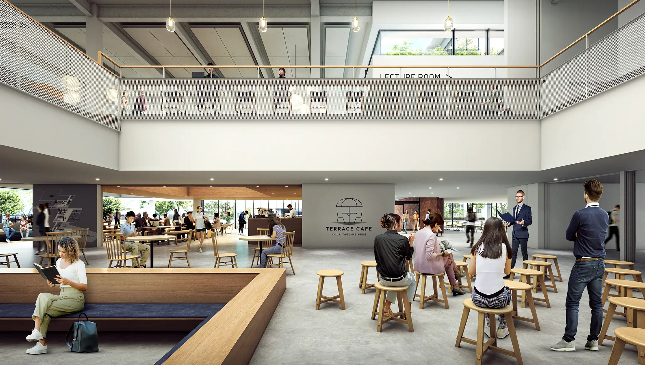 キャンパスの中心に、広場と連続するカフェ、大壁面のホワイトボードがあるスタディラウンジ、発表の場にもなる段々ラウンジ、緑と自然光のもと集中できる自習室など、学びのきっかけになる場所を用意しています。また、学生支援センターや教務センター、ボランティア活動支援室、い~ぷらといった施設が集約され、コンビニやカフェといった施設も充実し、学生・教職員の活動をサポートします。