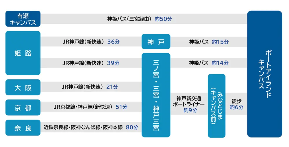 神戸市営地下鉄「三宮駅」から、神戸新交通ポートライナー「みなとじま(キャンパス前)駅」下車、西へ徒歩約6分。