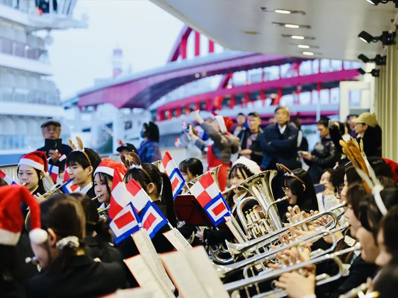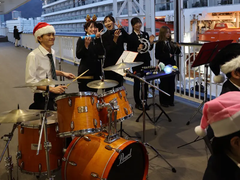 クリスマスの衣装を着用した吹奏楽部のメンバーは、出港時に「オリンピックファンファーレ」「ラ・ラ・ランド」「クリスマスメドレー」の3曲を披露しました。