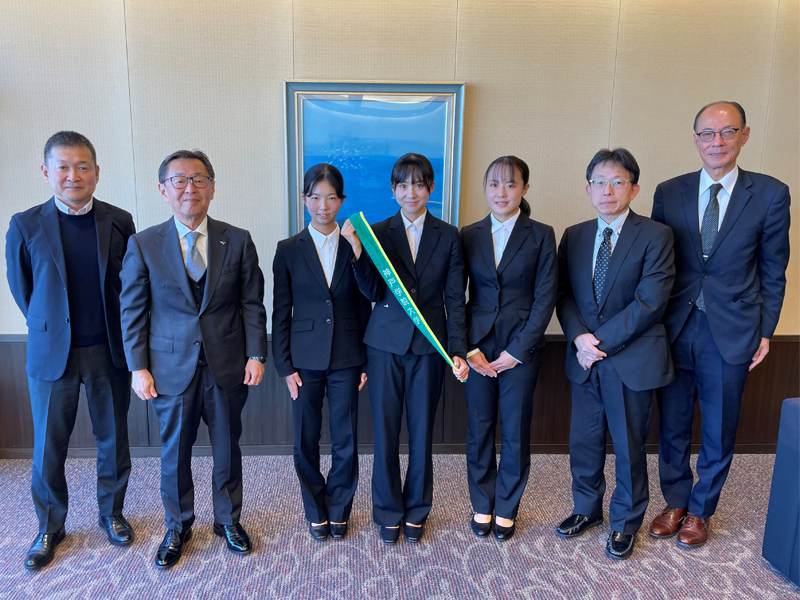 女子駅伝競走部の部員と指導者が12月18日、備酒伸彦学長、住本武司法人事務局長、高山修大学事務局長を表敬訪問し、「2025全日本大学女子選抜駅伝競走」(富士山女子駅伝)出場決定を報告しました。