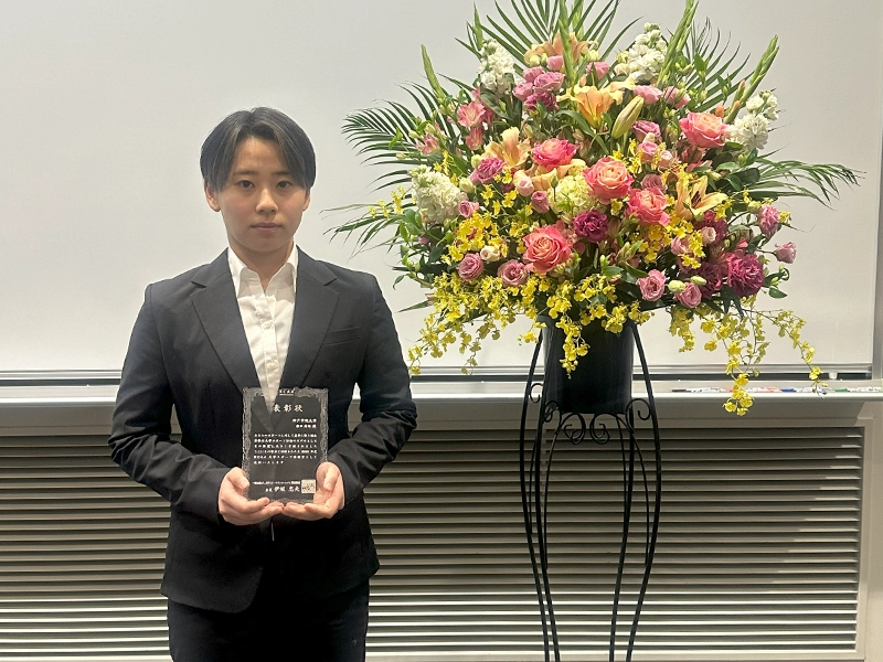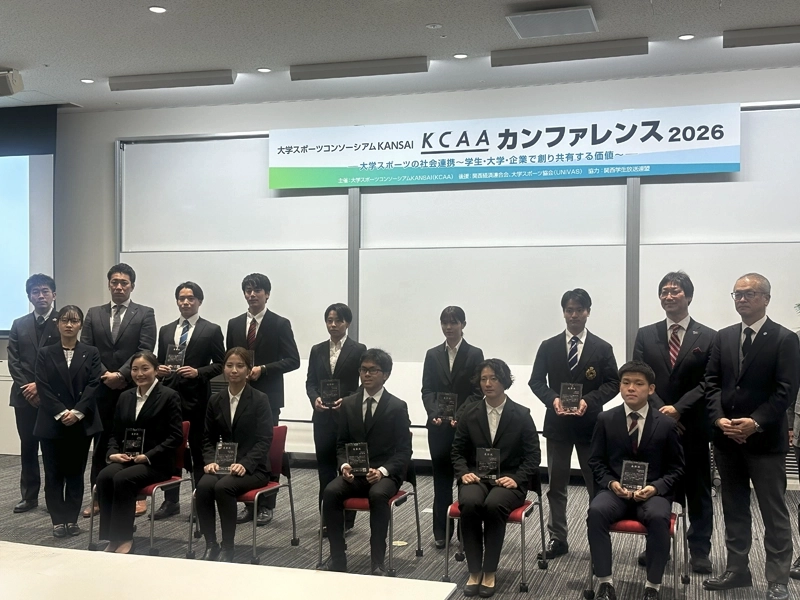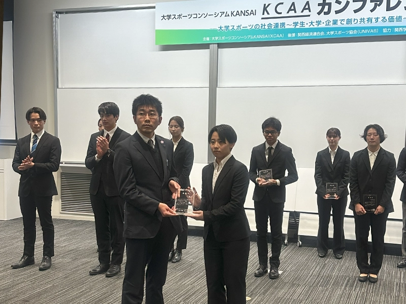 同賞は大学スポーツに関わる活動のモデルとなりうる個人の活動実績を顕彰し、今後の活躍を奨励することを目的に、KCAA(一般社団法人大学スポーツコンソーシアムKANSAI)正会員校に在籍する学生個人に授与されます。この日開かれた「KCAAカンファレンス2026」の席上で受賞者の表彰式があり、表彰盾を授与されました。