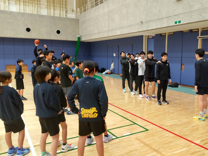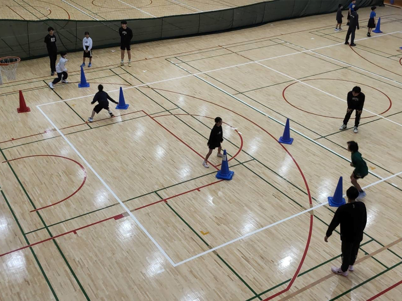 小学1年生から6年生までの参加者約60人は、バスケットボール部の山下新樹監督や部員らの指導で本格的な練習メニューに取り組み、基本的な動きやチームワークの大切さを学びました。