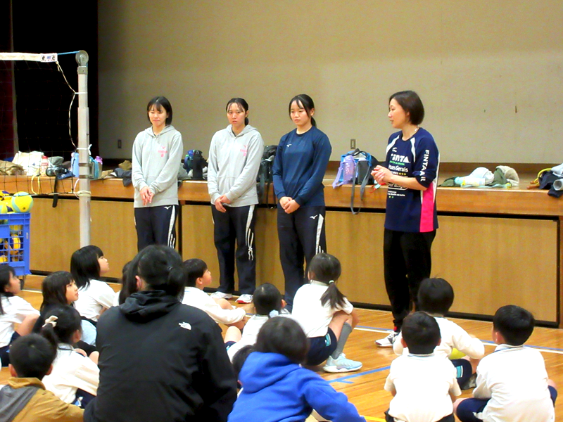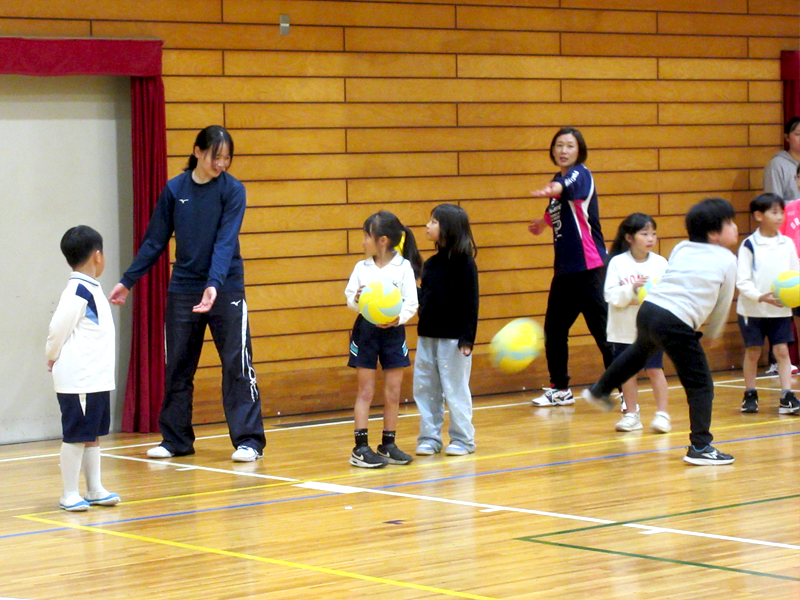 バレーボール部の門内帆澄コーチに加え、部員の上田萌果さん、小林柚葉さん、伊藤愛菜さんの4人が12月11日、神戸市立福住小学校の体育館で学童保育に通う子どもたちを対象としたバレーボール体験会を実施し、部員が考えたプログラムをもとに、子どもたちにバレーボールの楽しさを伝えました。