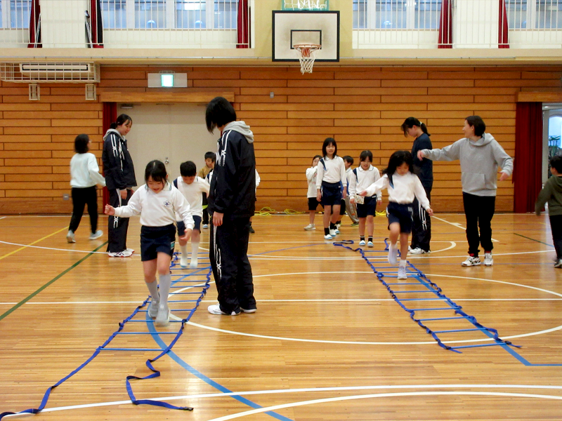 体験会では、まずウォーミングアップとして、鬼ごっこやラダートレーニング(ひも状のはしごを使用したトレーニング)、大縄跳びを行いました。学生は鬼ごっこの鬼役を務めたり、大縄跳びの縄を回したりしながら、子どもたちと一緒に体を動かしました。