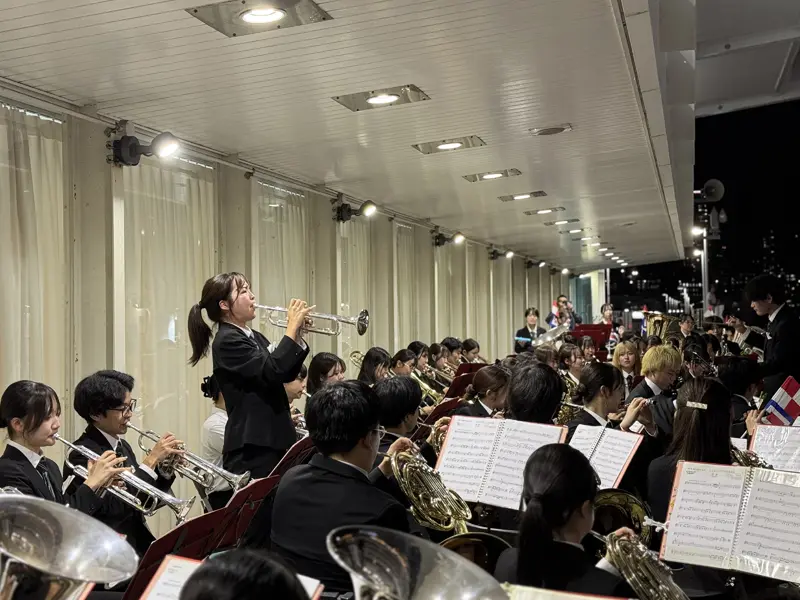 次期部長の合田仰良さん(心理学部3年次生)は「乗客の皆さんが楽しんだ気持ちで出港できるように意識して演奏しました。12月の定期演奏に向けて、1曲ずつ大切に練習し、新体制になってからもよりよい演奏を届けることができるよう頑張りたいです」と抱負を語りました。