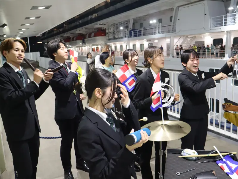 船が港を離れた後も学生に歓声が送られ、現4年次生にとって最後となった客船演奏に花を添えました。