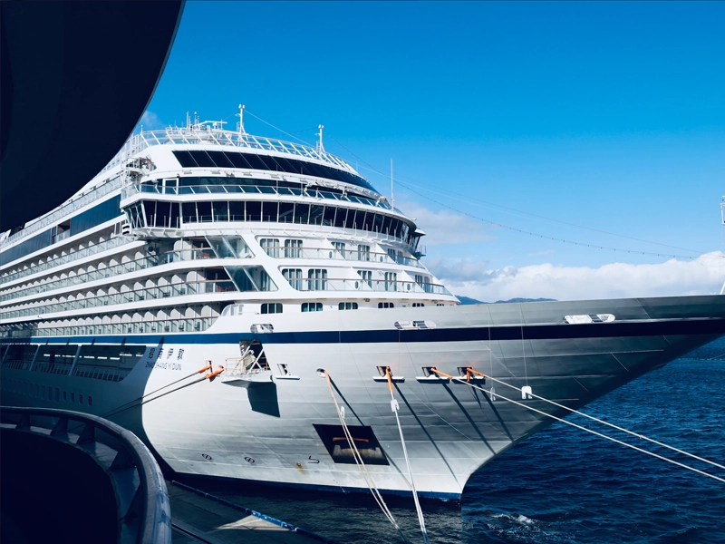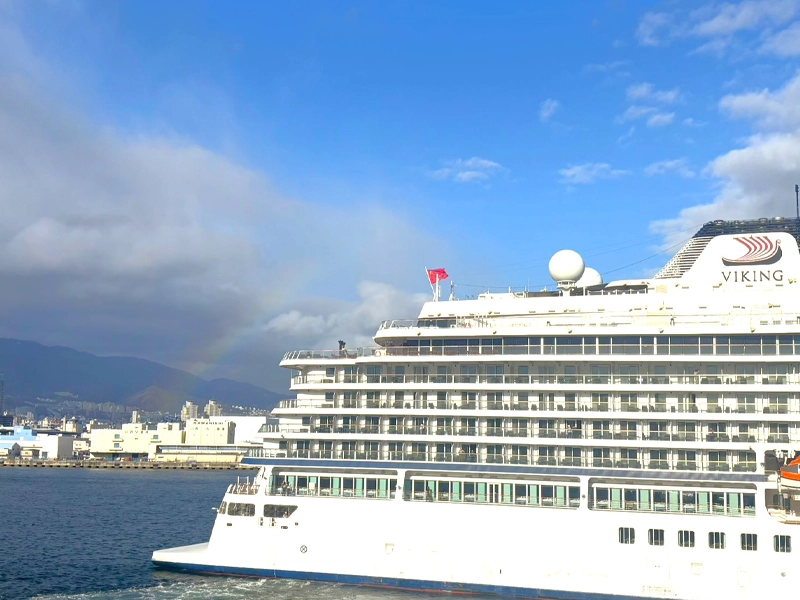 吹奏楽部約50人が北欧のバイキング・クルーズ「VIKING YI DUN」の歓送演奏を3月4日にポートターミナルで行い、出港時に、「オーメンズ・オブ・ラブ」「ラ・ラ・ランド」「銀河鉄道999」「ウィーアー」の4曲を披露しました。
