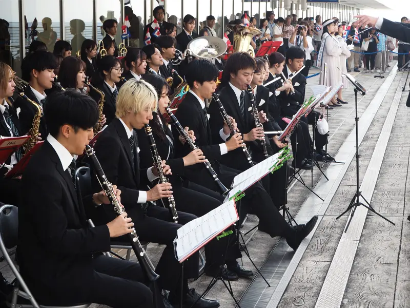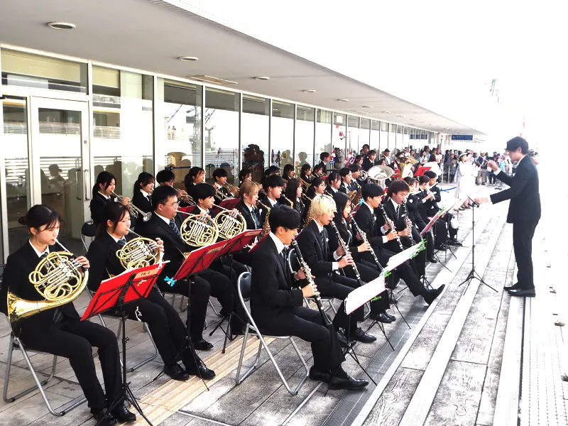 演奏は「飛鳥Ⅲ」の神戸港デビュークルーズ記念セレモニー前に入港歓迎イベントとして企画され、吹奏楽部41人は、入港時に「怪獣」「オーメンズ・オブ・ラブ」「宝島」「Bow and arrow」などのJ-POPや洋楽のバラエティに富んだ4曲を披露し、華やかな音色と迫力あるアンサンブルで、会場は大きな拍手と歓声に包まれました。
