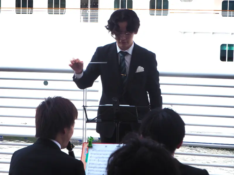 指揮を務めた東海林元就さん(人文学部3年次生)は「乗船客の誰もが楽しめるよう、人気のある曲を選曲しました。本番では、楽しく演奏することを心掛け、一人ひとりに音が届くよう、室内と屋外で音響が届く距離感が異なることに注意しながら、指揮を振りました」と話しました。