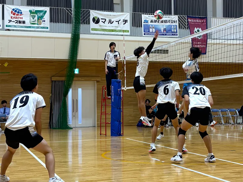 私たちは、現在関西大学バレーボール連盟2部に所属しており、春季リーグで1部昇格を目指して日々練習に取り組んでいます。1試合でも多く勝つために工夫して練習を丁寧に行っています。夏になると、大蔵海岸でビーチバレーをする期間もありインドアバレー、アウトドアバレーともに良い結果を残せるように努力しています。