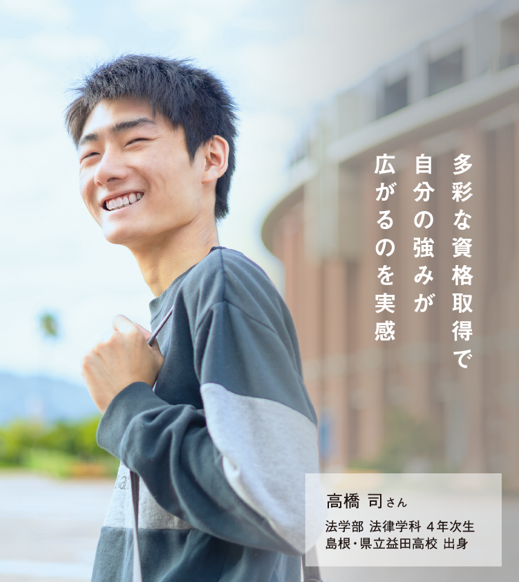 公務員試験対策講座や資格取得が単位認定される制度など、目標に向かって勉強に集中できるバックアップ体制が役立ちました。就職活動の進め方に迷ったときは、キャリアセンターの親身な対応にも助けられました。