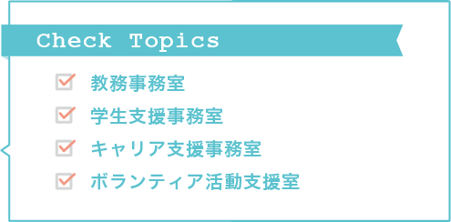 2つのキャンパスに、大学生活の疑問や不安について相談できる多彩な窓口を設置しています。単位の修得や心身の健康管理、キャリア支援に関する相談はもちろんのこと、アルバイト・ボランティア情報を発信する窓口も。充実した学生生活を送れるよう、多角的にバックアップします。