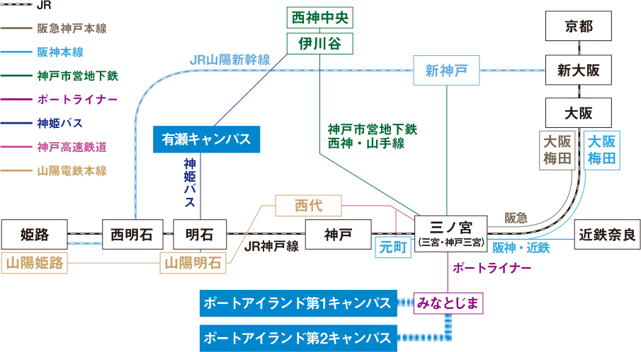 ポートアイランドキャンパスは三宮から直通バスでダイレクトにアクセス可能!大阪や奈良からも、少ない乗り換え回数で登学することができます。有瀬キャンパスへも、明石駅からのバス便が豊富。大学の目前に停車します。