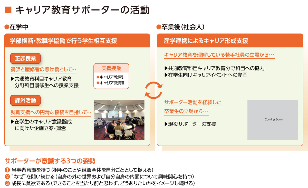 キャリア教育サポーターとは、学生が主体となって教職員と協働しながら、後輩学生の授業支援や学内のキャリア意識向上を促す活動を通して、学生同士で学びを支援しあう学生団体。 “学生”だからこその視点を活かしたキャリア支援を行っています。