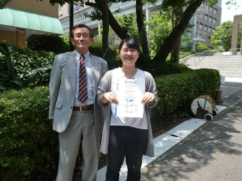 雁金さんは、sehr gut(秀)という非常に優秀な成績でA1レベルに合格し、共通教育センターの古田恒輔所長より、合格証が授与されました。雁金さんは1年次後期から「独検」(正式名称:ドイツ語技能検定試験)も受験していて、2年間で5級・4級・3級すべてに合格しています。皆さんも英語だけでなく、第二外国語にも目を向けてみませんか。期待以上の成果が上がるかもしれません。