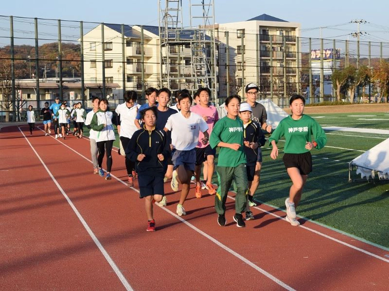 実践では参加者を10~20人の班に分け、ロスのないランニングフォーム習得の実習をしました。その後、4000mを1km4’00、4’30、5’00、の3グループに分けて、選手が先導して走りました。また初心者はファンランとして、クロスカントリーを7~8人のグループで選手のフォームに合わせて走りました。