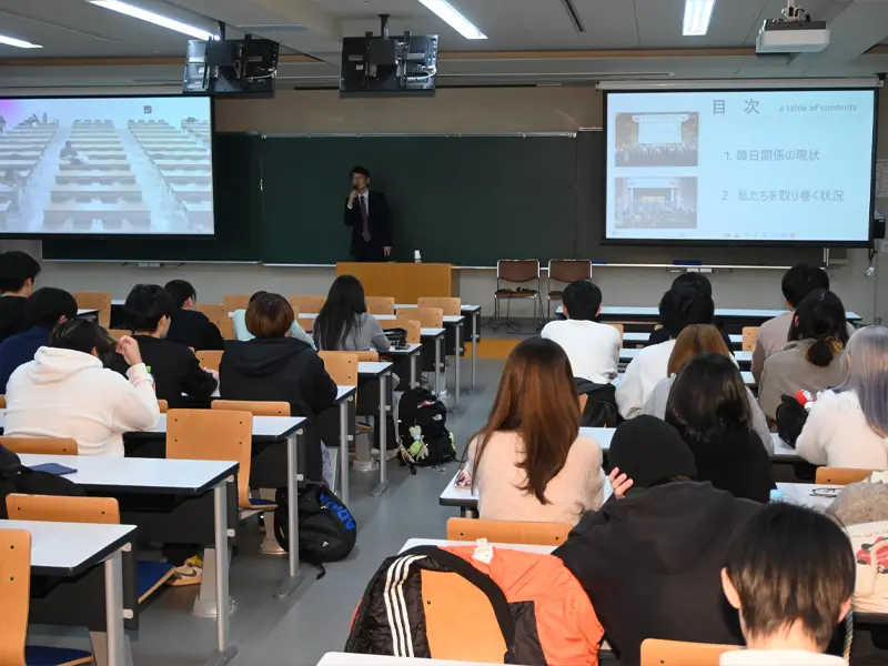 李総領事は東京の大使館で2度勤務した経験があり、流ちょうな日本語で「両手を携え、よりよい未来へ~堅固で成熟した韓日関係へ」と題して講義しました。大使館や全国に9カ所ある総領事館の役割についての説明から始まり、江戸時代、約200年間に12回も日本を訪れた朝鮮通信使との善隣友好や、日本による朝鮮半島の植民地支配などに見られる両国の歴史を「友好親善と痛みが共存する関係」と表現しました。