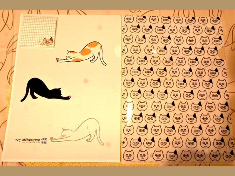 また、テーブルではゼミ生がデザインした猫グッズのファイルや付箋も展示しています。ファイルと付箋は河野桜子さんら、ポストカードは西本楽さんが撮影した写真で作成しました。同じイベントスペースには神戸マルイが募集したかわいいペットの猫たちの写真パネルのコーナー「みんなのにゃんこ展」もあります。