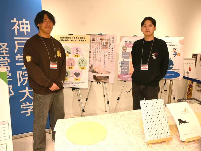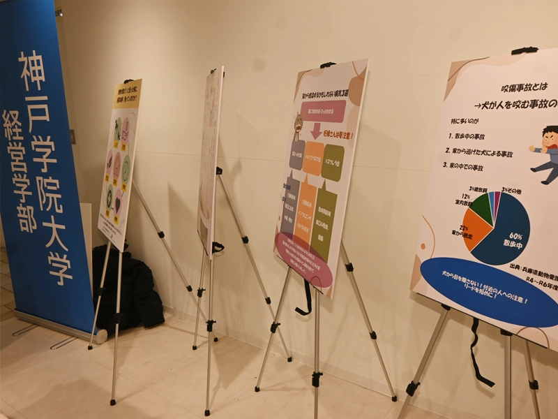 7枚のパネルは、年間を通じてゼミの授業で講義をお願いしている兵庫県動物愛護センターの協力を得て作りました。「猫から感染するかもしれない病気」のパネルでは、「かまれない」「ひっかかれない」「猫と触れ合ったら手洗い、うがいなど感染対策をする」などと呼び掛けています。