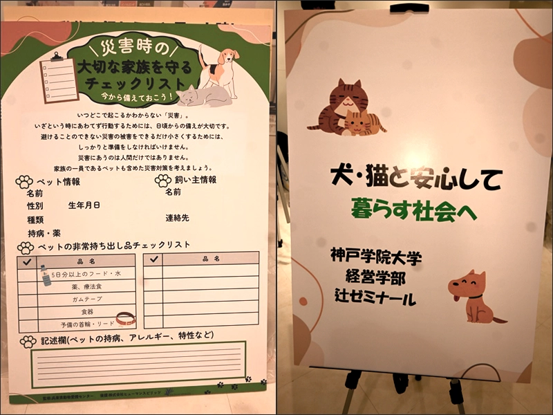 犬にかまれてけがや病気をする「咬傷(こうしょう)事故」については、同センターの2022年~24年の統計によると、散歩中に約6割が発生しており、「犬から目を離さない」「リードは短めにする」などの注意点を書いています。飼わなくても犬や猫と触れ合える機会の具体例や、災害発生時にペットのために持ち出すと良い品のリスト、神戸マルイで開かれる保護猫譲渡会の案内も掲示しています。
