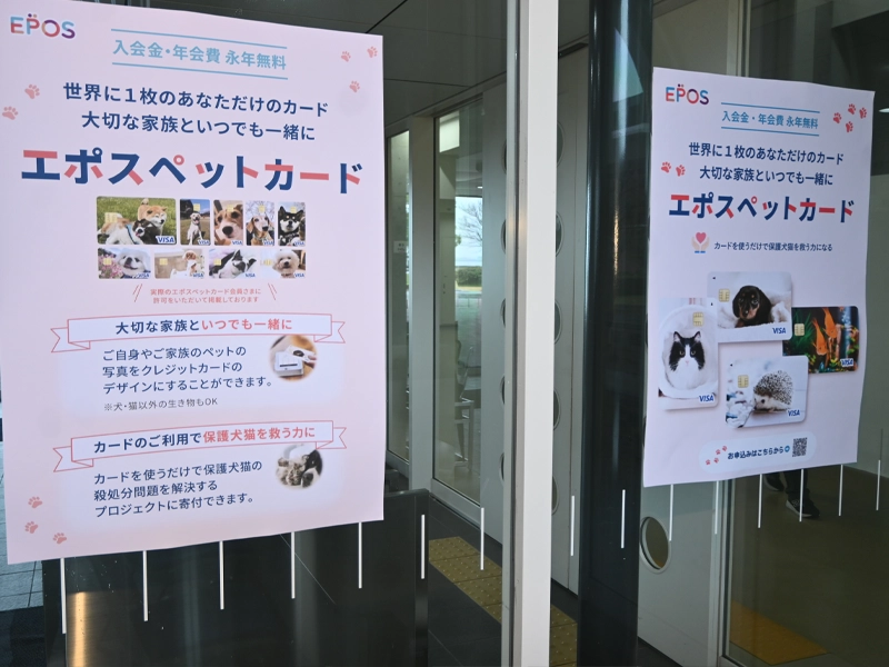 丸井グループなどで普及に取り組んでいる「エポスカード」(クレジットカード)はデザインや機能が100種類以上あります。ペットの写真を表面にデザインし、利用額の一部を保護犬・猫を救うプロジェクトに役立てる機能のある「エポスペットカード」の紹介ポスターも壁際に貼りました。