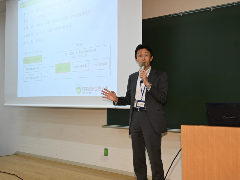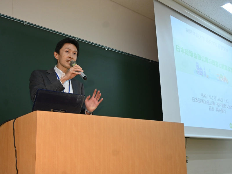 経営学部の石賀和義教授が担当する「企業ファイナンス論Ⅱ」の授業で12月18日、日本政策金融公庫(JFC)国民生活事業神戸創業支援センターの関谷善行所長が特別講義しました。