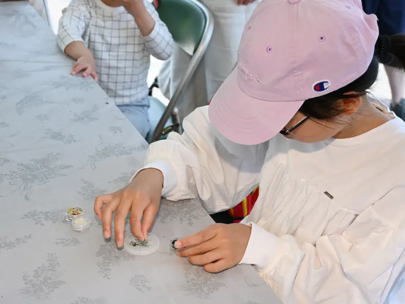LEDレジンを使ったクラフト体験で、一人100円とあって朝から子どもたちの行列ができました。モールド(型)にネイルの粉とレジン液を流し込み、LEDランプで照射すると固まって宝石のようにキラキラ。マグネットも付けて冷蔵庫などに貼り付けられるようにしました。2人間で計412人の子どもたちにキラキラマグネット作りを楽しんでもらうことができました。