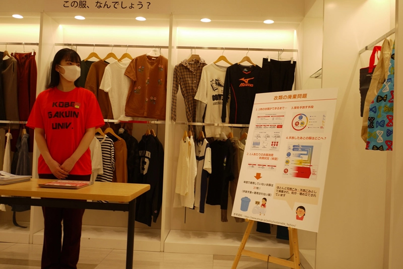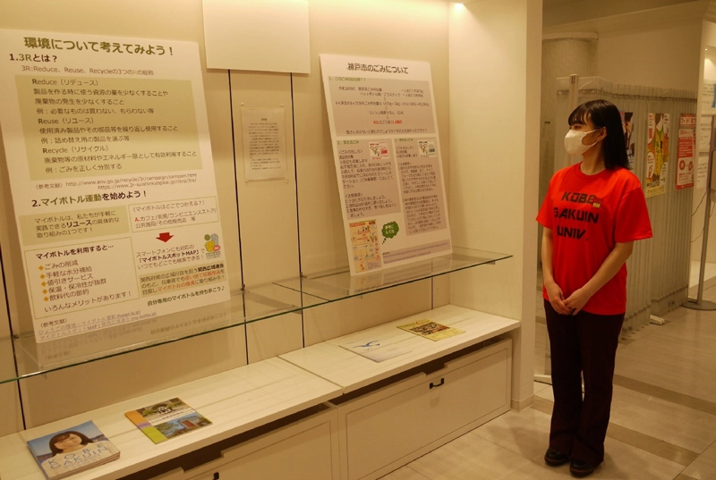 神戸市中央区の神戸マルイ3階で経営学部の辻幸恵教授の3年次ゼミ生が環境保護やごみ減量を考える展示をしています。1月末までで、ゼミ生は常駐しませんが、当番で来場者に応対しています。会場はフリマアプリ「メルカリ」の体験ストア「メルカリステーション」の隣です。