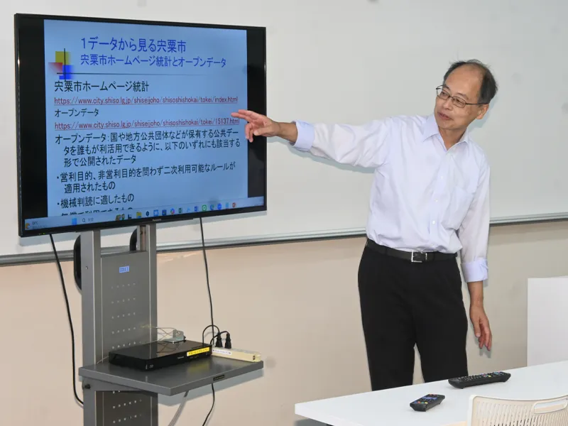 宍粟市の「道の駅はが ブラッシュアップ プロジェクト」に取り組んでいる経営学部の石賀和義教授の3年次生ゼミで兵庫県立大学ソーシャルデータサイエンス研究所の芦谷恒憲特任教授が10月8日、統計データの活用方法について特別講義しました。