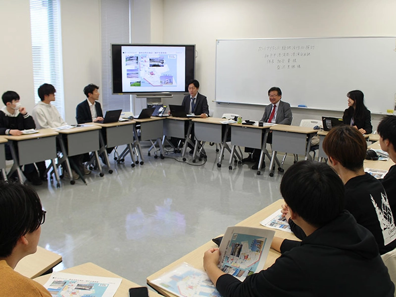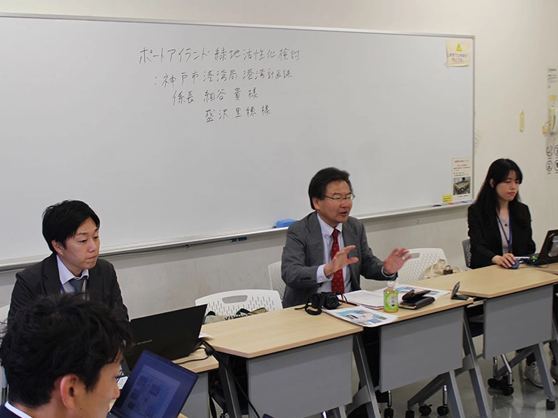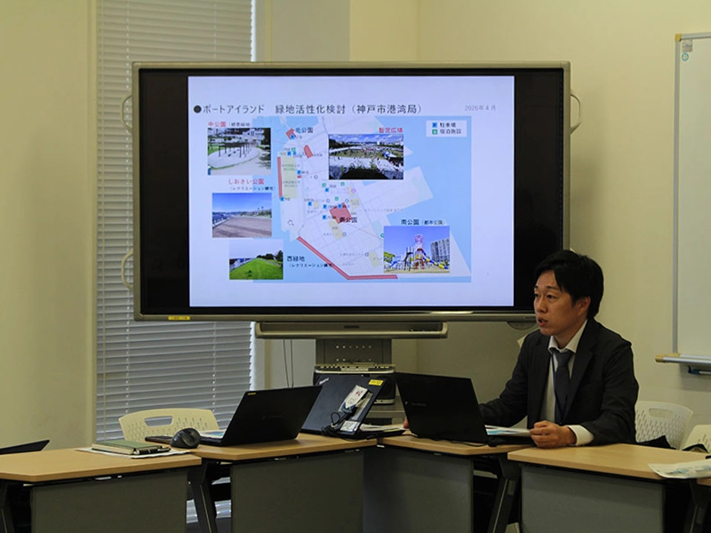 経営学部の田中康介教授のゼミ(3年次生16人)と神戸市との官学連携「ポーアイ緑地活性化」プロジェクトが本格スタートし、4月15日に神戸市港湾局から、細谷貴氏と盛沢里穂氏が来学し、局内での検討内容について説明しました。