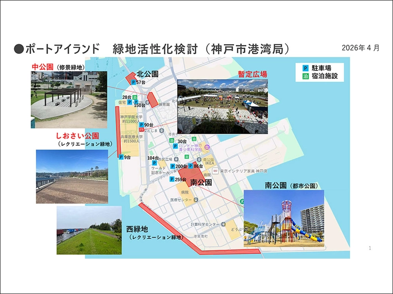 本プロジェクトは、ポートアイランドにおいて神戸市港湾局が管理する緑地(中公園・しおさい公園・暫定広場など)の活性化、および利用促進のための利活用方法を提案する事を目的としています。