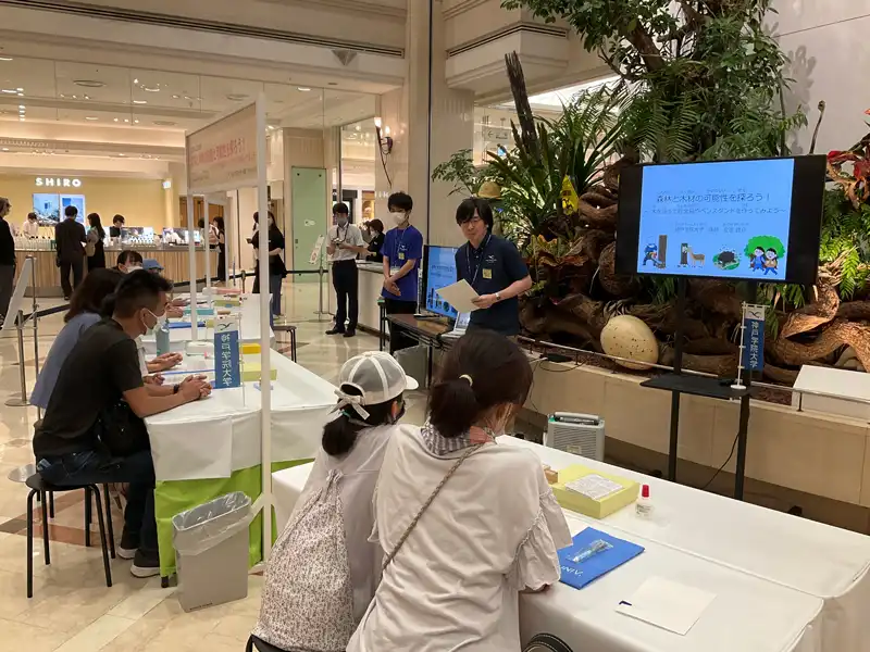 経済学部の安逹啓介講師が7月23日にワークショップ「森林と木の役割と可能性を探ろう!~木を使って貯金箱やペンスタンドを作ってみよう~」を大丸神戸店1階メインステージ前で実施しました。