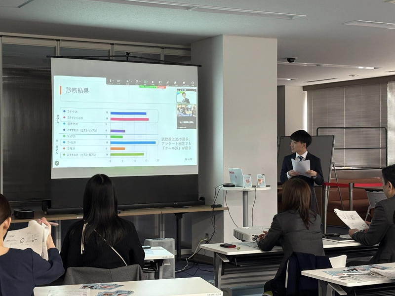 診断結果とイベント参加者へのアンケートの結果、「イベントを通じて日本酒に興味が湧いた・もっと知りたい」と回答した人は90%に達しました。また、「女性は低アルで甘口を好む」という学生たちの事前の予想を覆し、実際には辛口や本格的な味わいの「クール派」が最も支持されたという分析結果となりました。さらに、アンケート結果を受けて、学生たちは新規層の開拓には「自分に引き付けた楽しい体験」の機会をふやしていくことが重要であると述べました。