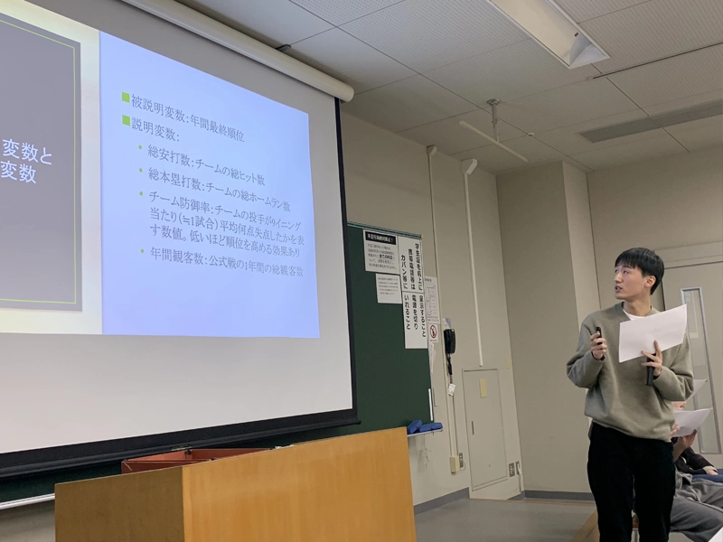 経済学部の岡本弥准教授の2年次生(当時、現在は3年次生)ゼミが1月21日、データ分析の報告会を開催しました。