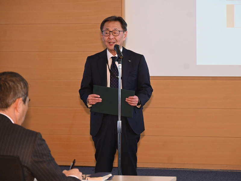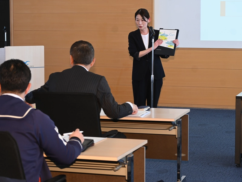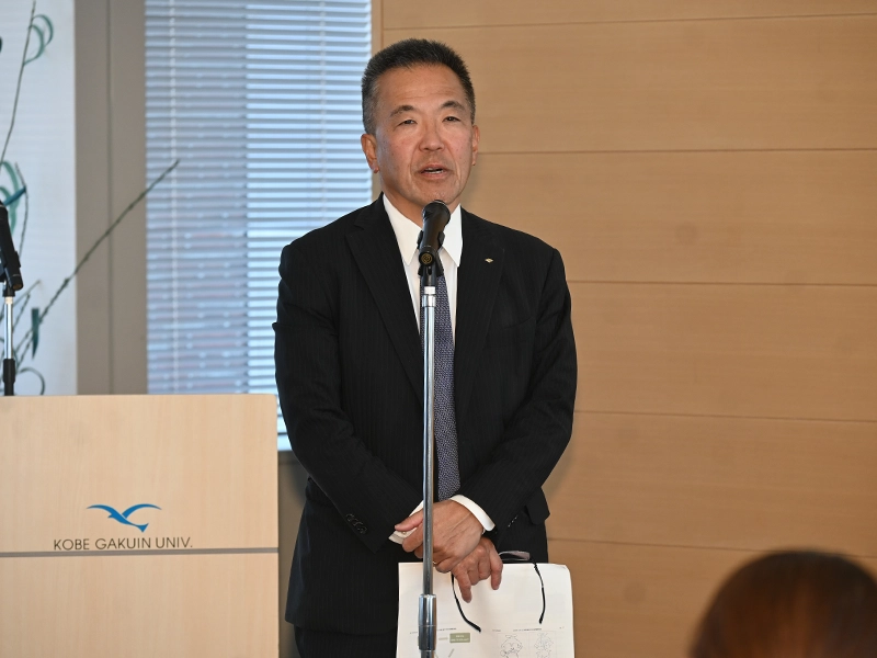 発表会には早駒運輸の渡辺真二代表取締役社長、釣舩勝己取締役をはじめ、担当社員の皆さん、大学コンソーシアムひょうご神戸の山崎智佳子事務局長と大島一英さん、備酒伸彦学長と経済学部の毛利進太郎学部長らが出席しました。