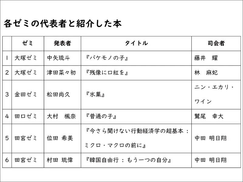各ゼミの代表者と紹介した本は別紙の通りです。