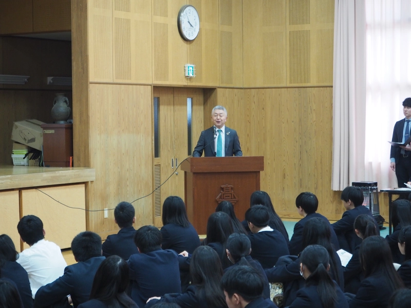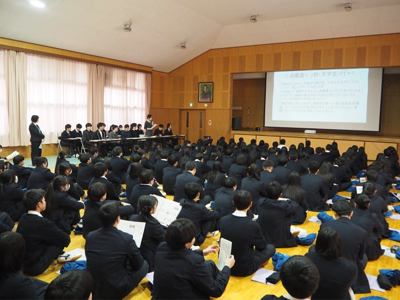 発表会には宍粟市の福元晶三市長をはじめ、しそう森林王国観光協会の富田健次理事長、西兵庫信用金庫の桑垣喜一理事長、平山敬司常務理事、県立山崎高等学校の木村友一教頭を含む関係者約20人と本学から備酒伸彦学長、高山修大学事務局長が参加し、さらには県立山崎高等学校の1年生約120人が集まりました。