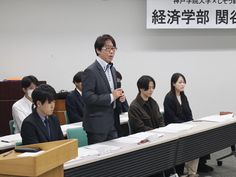 経済学部の関谷次博教授とゼミ生6人が11月11日に宍粟市役所で、西兵庫信用金庫地域活性化プロジェクトの中間発表会を行いました。