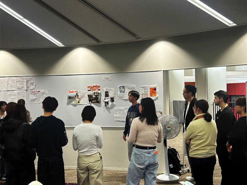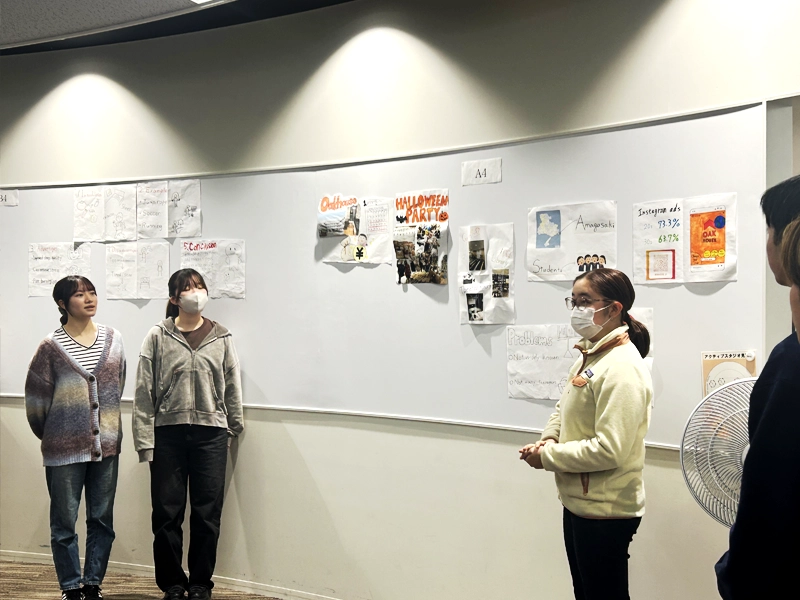 2時限目に「オークハウスの認知度をどのように高めるか」のテーマで発表した1年次生グループのポスターは尼崎市にあるシェアハウス「ソーシャルレジデンスアカデミア大阪尼崎」(110室)の外観やハロウィンパーティーの様子の写真、利用は賃料4万8000円からで1カ月から利用できるシステムなどを紹介しました。順番に発表した学生は「内部にはジムや図書室、シアタールームもあります」「居住者以外も参加できるハロウィンパーティーに行きましたがとても楽しかったです」などと話し、魅力を伝えました。認知度を高める方法は「若者に人気のインスタグラムを活用する」と提案しました。さらに利用者を増やすための課題としては、「ティーンエージャーが少ない模様なので、高校生や大学生にもっとアピールする」と述べました。