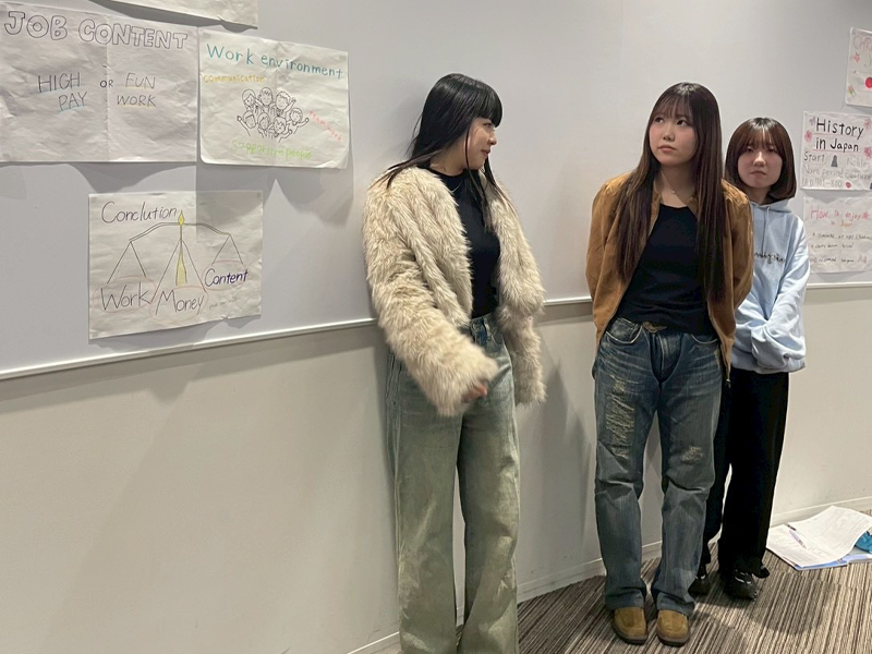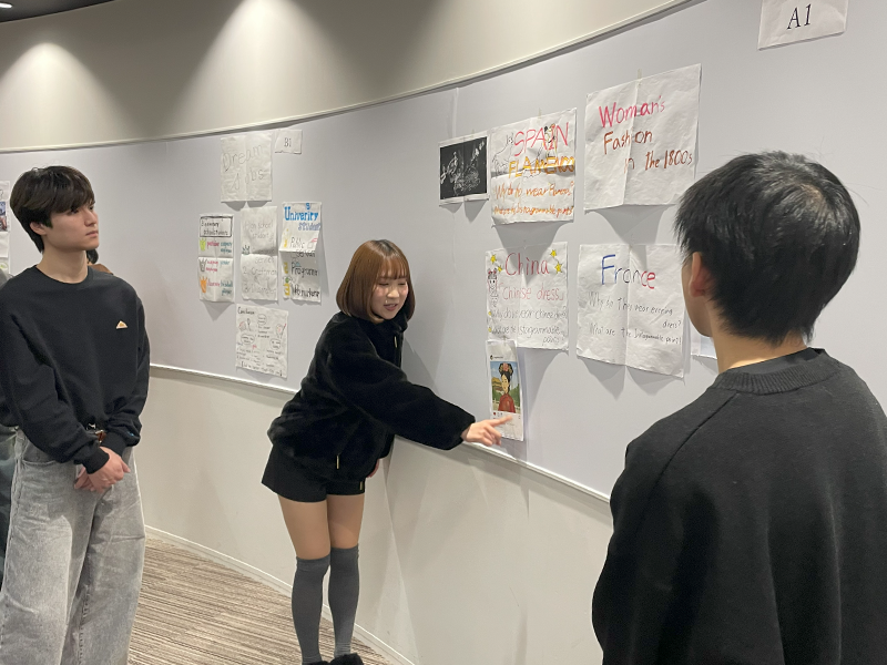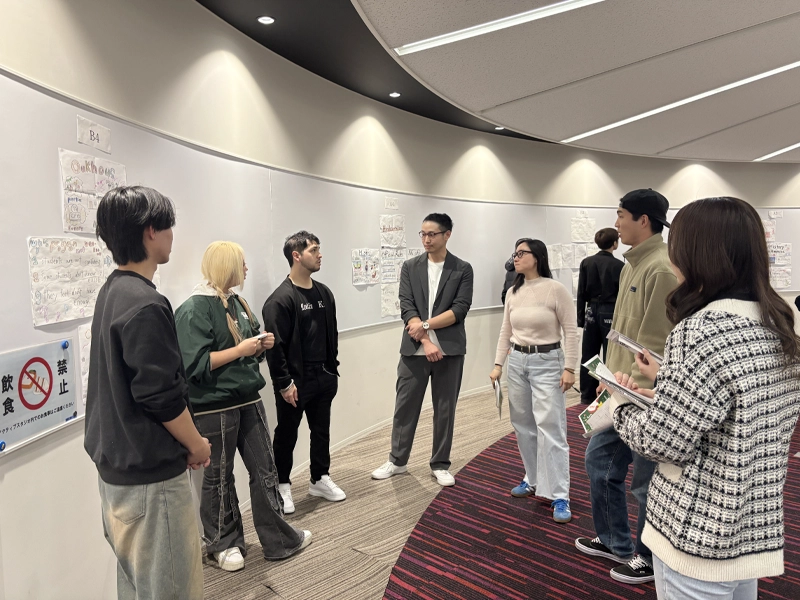 全国でシェアハウスなどを展開している株式会社オークハウス(本社・東京都豊島区)の「国際型シェアハウスが360度の問題に対して解決策となるか(認知度を高めたい)」との課題に1、2年次生の2グループが調査したことやアイデアをポスターにまとめ、発表しました。