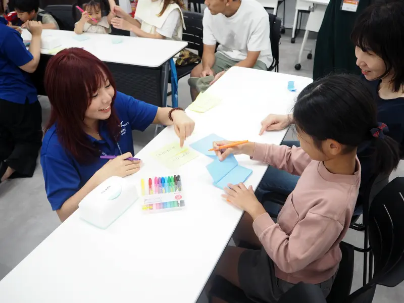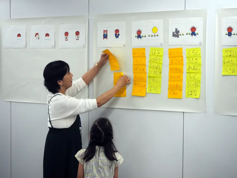 次に、絵だけが描かれた「じのないえほん」を使って、想像力を膨らませながら使える言葉を付箋に書き出していきました。中西教授から「日本語の絵本をつくる時は、音の数を工夫することで心に残る」とアドバイスを受けながら、子どもたちは自分だけの絵本づくりに夢中になっている様子でした。また、子どもたちは自分が考えた言葉が、韻を踏んでリズムよく読むことができるととても嬉しそうでした。