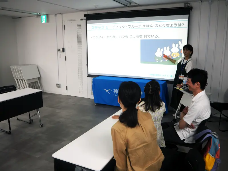 グローバル・コミュニケーション学部の中西のりこ教授が、10月11日に体験型公開講座「ミッフィーで学ぶ ことばのリズム ~自分だけのおはなしを作ろう~」をKOBE Co CREATION CENTERで実施しました。当日は小学1~2年生の親子4組11人が参加し、グローバル・コミュニケーション学部1年次生の藤野陽香さん、渡邊真優さんの2人がサポートを務めました。