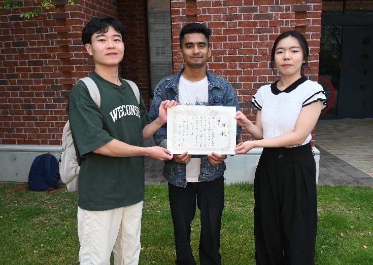 3人は、リーダーのマムン エムディ アブドゥラさん(3年次生、バングラデシュ出身)、コウ ケンイさん(3年次生、中国出身)、カッンヤティチョーさん(1年次生、ミャンマー出身)です。