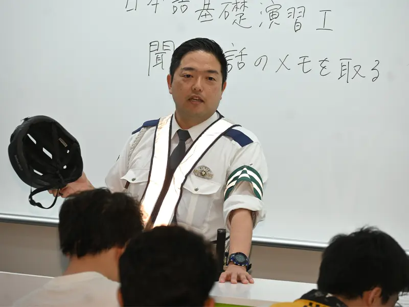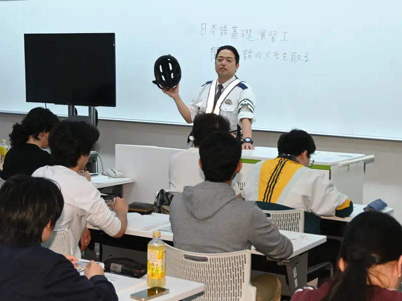 最後に交通課の署員からは自転車に乗るときは必ずヘルメットをかぶり、自転車保険にも加入しなければならないとの注意がありました。飲酒運転など重大な交通違反で赤切符を切られるのはもちろん、携帯電話を見ながら自転車を運転するなどの違反で青切符を切られると在留資格の更新に影響が出る可能性があるとの話に、留学生は真剣に耳を傾けていました。