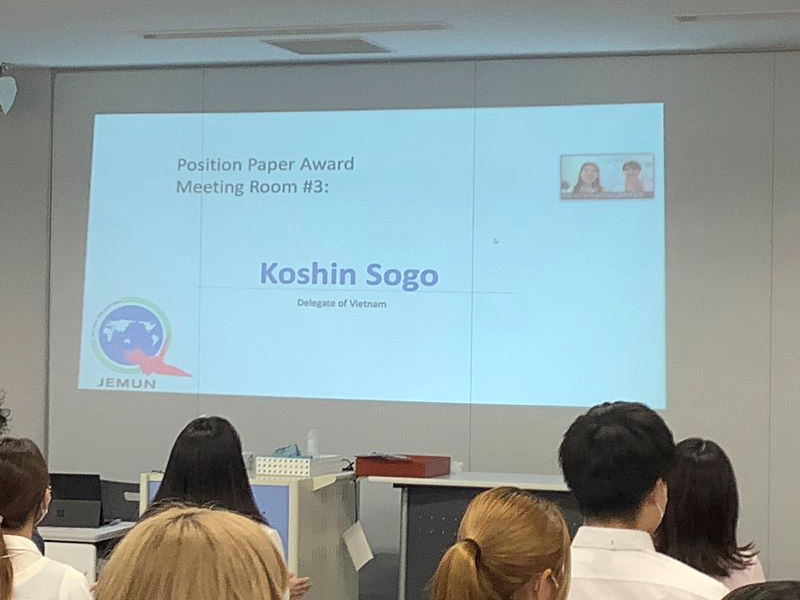 対面で開催された大学生の会議室は3つあり、計142人(11大学)の大使が参加しました。そのうちのひとつの会議室において、今回で4回目の英語模擬国連参加となる十河幸神さんが、交渉における卓越したリーダーシップと政策提案の良さをかわれ、「ベスト・ポジションペーパー賞」を受賞しました。