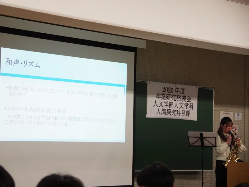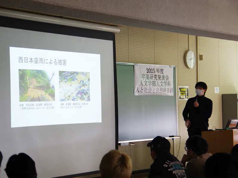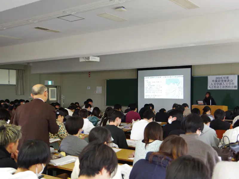 人文学部の卒業研究発表会が1月31日、有瀬キャンパス6号館の3教室を使用し、人間探究科目群、言語・文学科目群、人と社会と自然科目群の3会場に分かれて開催され、人文学部の3・4年次生が参加しました。