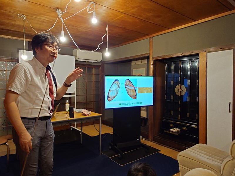 明石市大蔵八幡町の「明石ハウス」で9月24日、地域研究センターの主催する一般向け講演会「大蔵谷ヒューマンサイエンスカフェ2025」が実施されました。人文学部の川上靖教授が「秋の鳴く虫の夕べー虫の音の聞き分け講座ー」と題し、鳴く虫の聞き分け方を中心に、虫が鳴く理由や生態について講演しました。