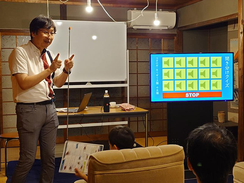 最後は、「コオロギ四種をマスターしよう!」ということで、身近で聞けるコオロギの聞き分けができるようになる方法が伝授されました。