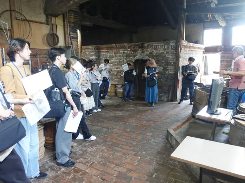 JR姫新線本竜野駅に集合し、同市の地場産業である醤油のメーカーや素麺製造の組合などが並ぶ通りを、矢嶋教授の解説を聞いて歩き、揖保川に架かる龍野橋を渡って龍野城下町の重伝建地区へ。連携先の西兵庫信用金庫、たつの市役所の職員の皆さんと合流し、老舗の糀(こうじ)店を営む井戸正文たつの市観光協会会長に、龍野における伝統産業の醤油(しょうゆ)や味噌(みそ)醸造のための水環境、町並み保存に向けた地元の動きや、糀店を継いで現在までに至ったライフヒストリーも伺いました。